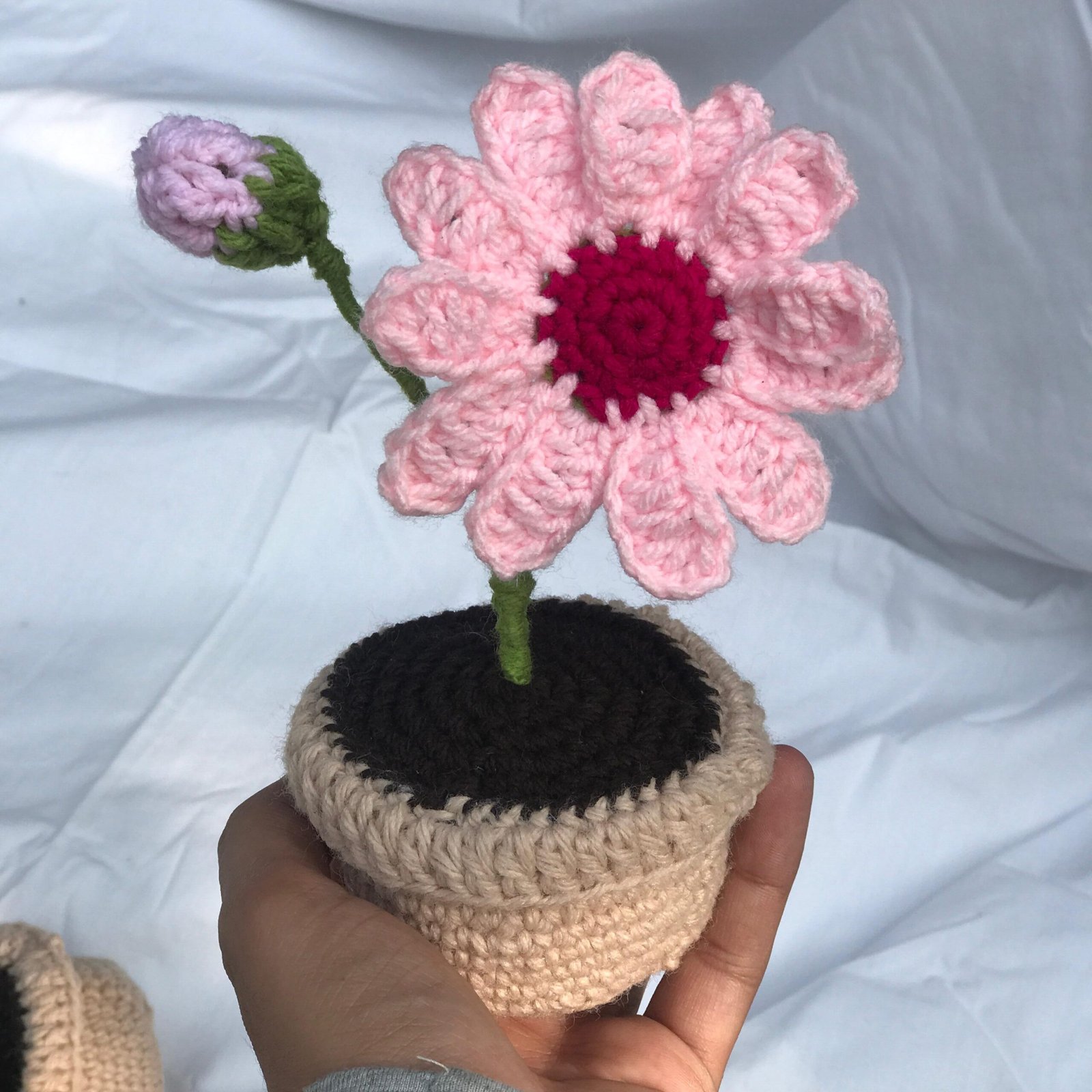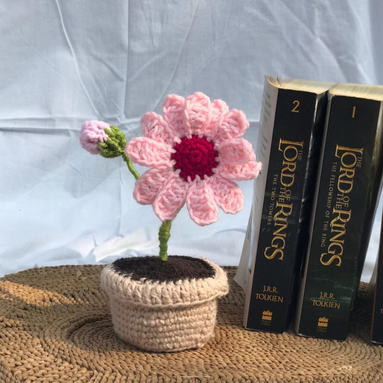 Add a cheerful touch to your space with this Crocheted Pink Daisy Plant Decor! Handcrafted with a vibrant pink daisy, a budding flower, green stem, and a cozy beige pot, this delightful piece brings a handmade charm to any room. Perfect as a unique home decor item or a thoughtful gift for book lovers.