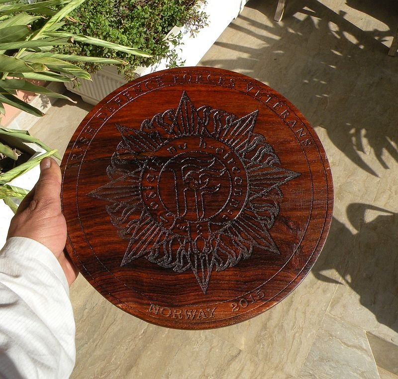 Made from premium rosewood or acacia wood and finished with a refined polish, this plaque features precision engraving that highlights logos, insignias, emblems, and commemorative text with exceptional clarity. The natural wood grain enhances the engraved artwork, creating a timeless and prestigious presentation.