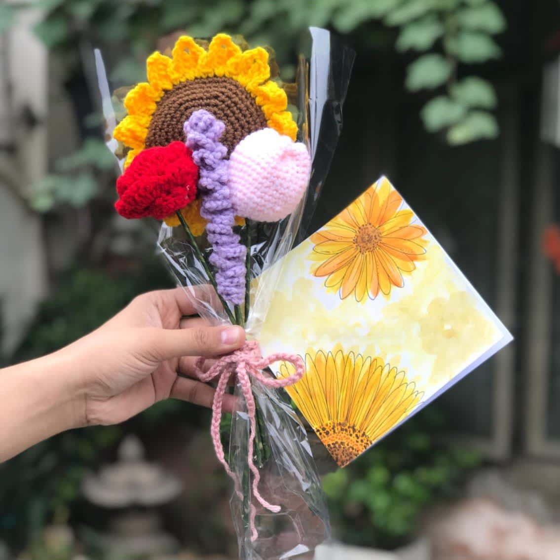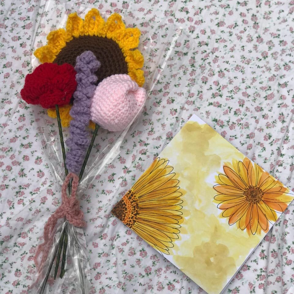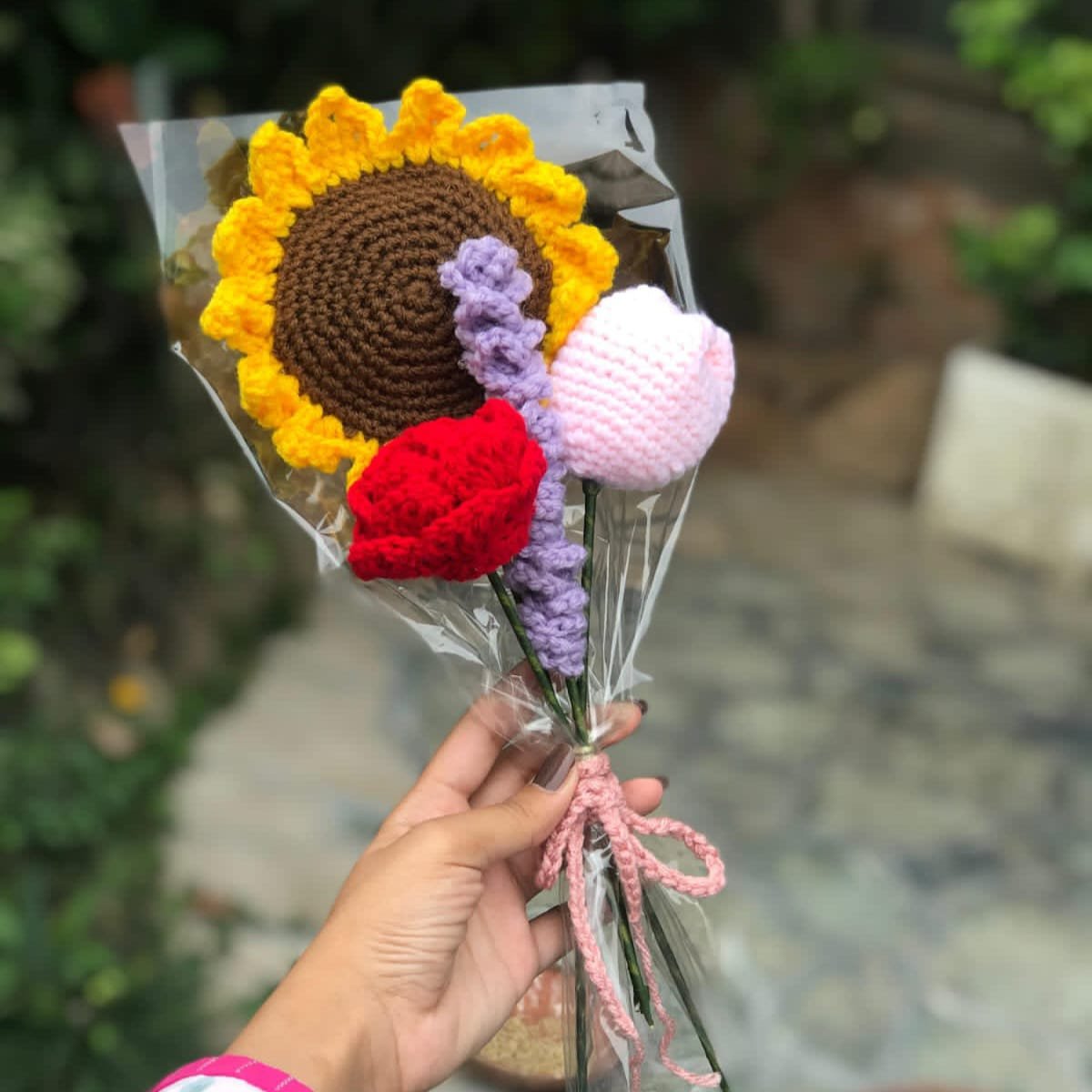 Celebrate diversity with this Handcrafted Mixed Bloom Bouquet, featuring a crocheted sunflower, red rose, pink tulip, and purple flower, all wrapped in clear cellophane and tied with a soft pink ribbon. A vibrant and unique handmade gift for any occasion.