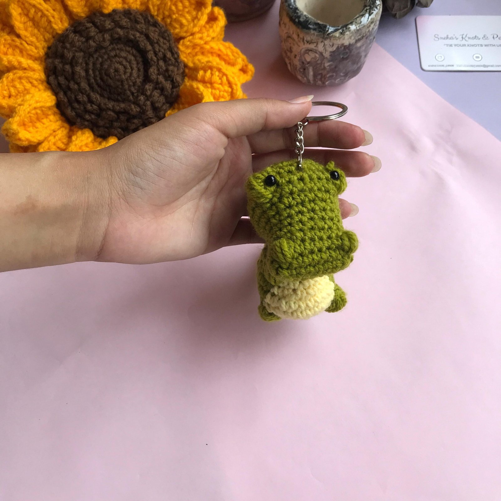 Add a playful touch to your keys with this cute handmade crochet alligator keychain! Crafted with care, this green alligator with a yellow belly is attached to a sturdy metal keyring. Perfect as a charming gift or a fun accessory, it’s sure to bring a smile to any wildlife enthusiast!
