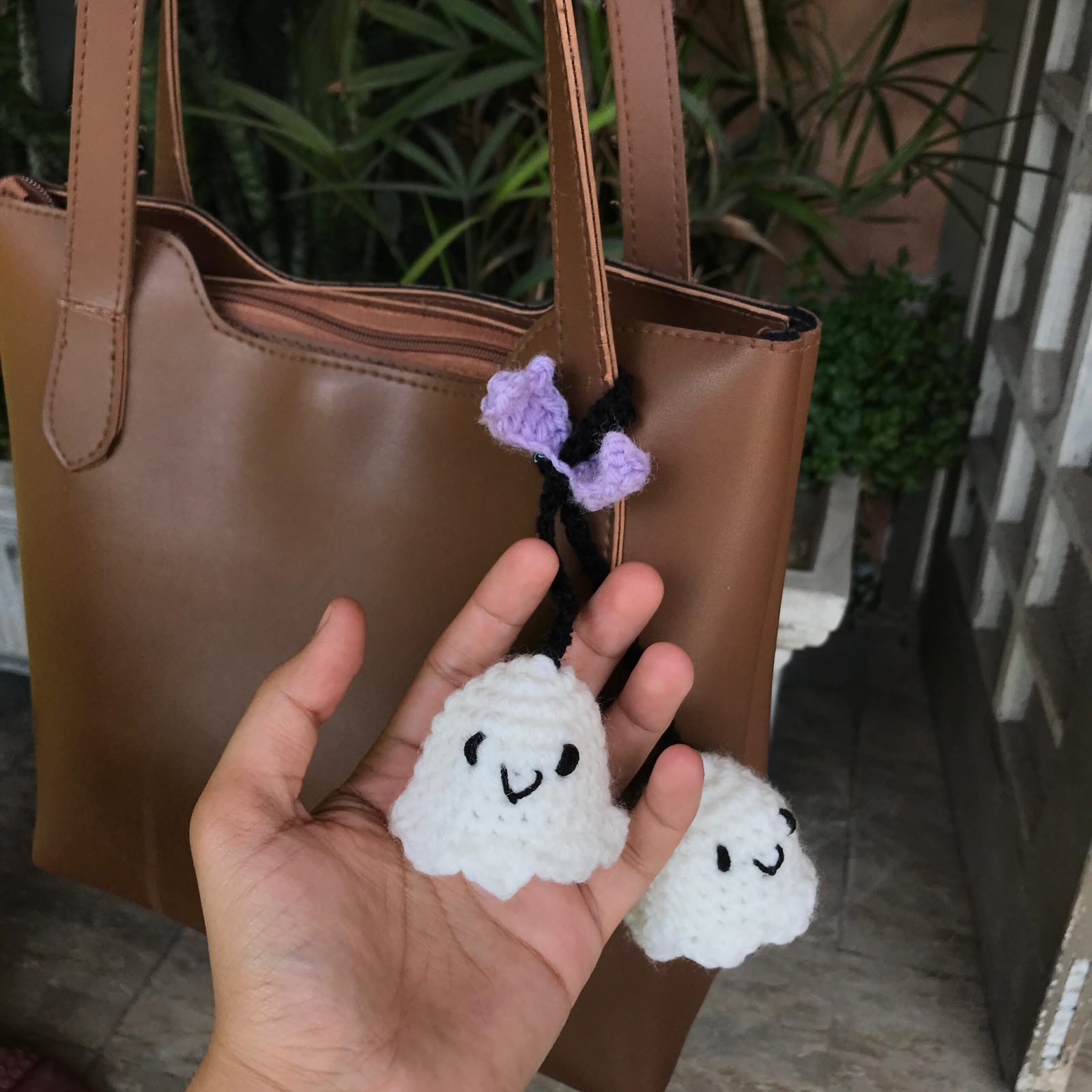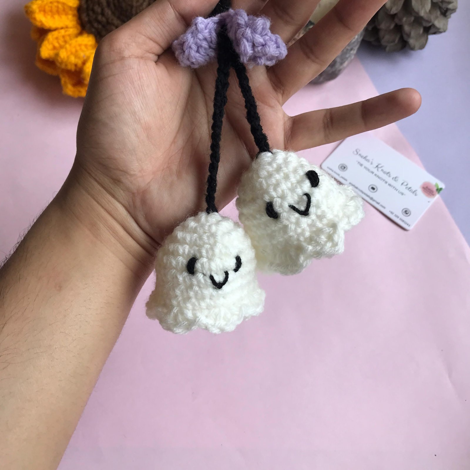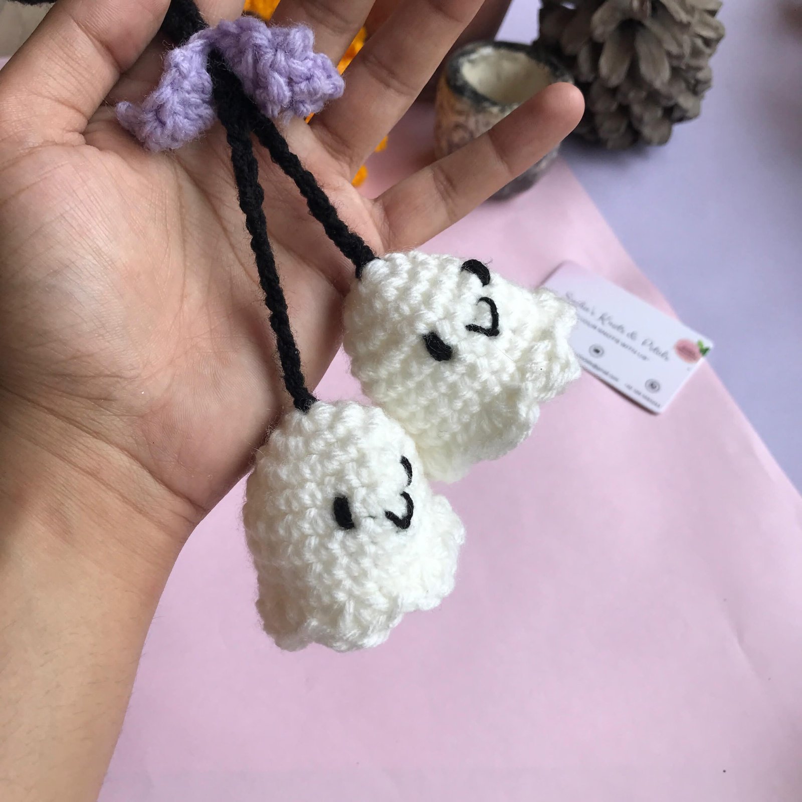 Spook up your style with this adorable handmade crochet ghost bag charm! Featuring two cute white ghosts with a black strap and a purple bow, this charming accessory clips onto any bag, adding a playful and whimsical touch. Perfect as a unique gift or a fun addition to your collection!