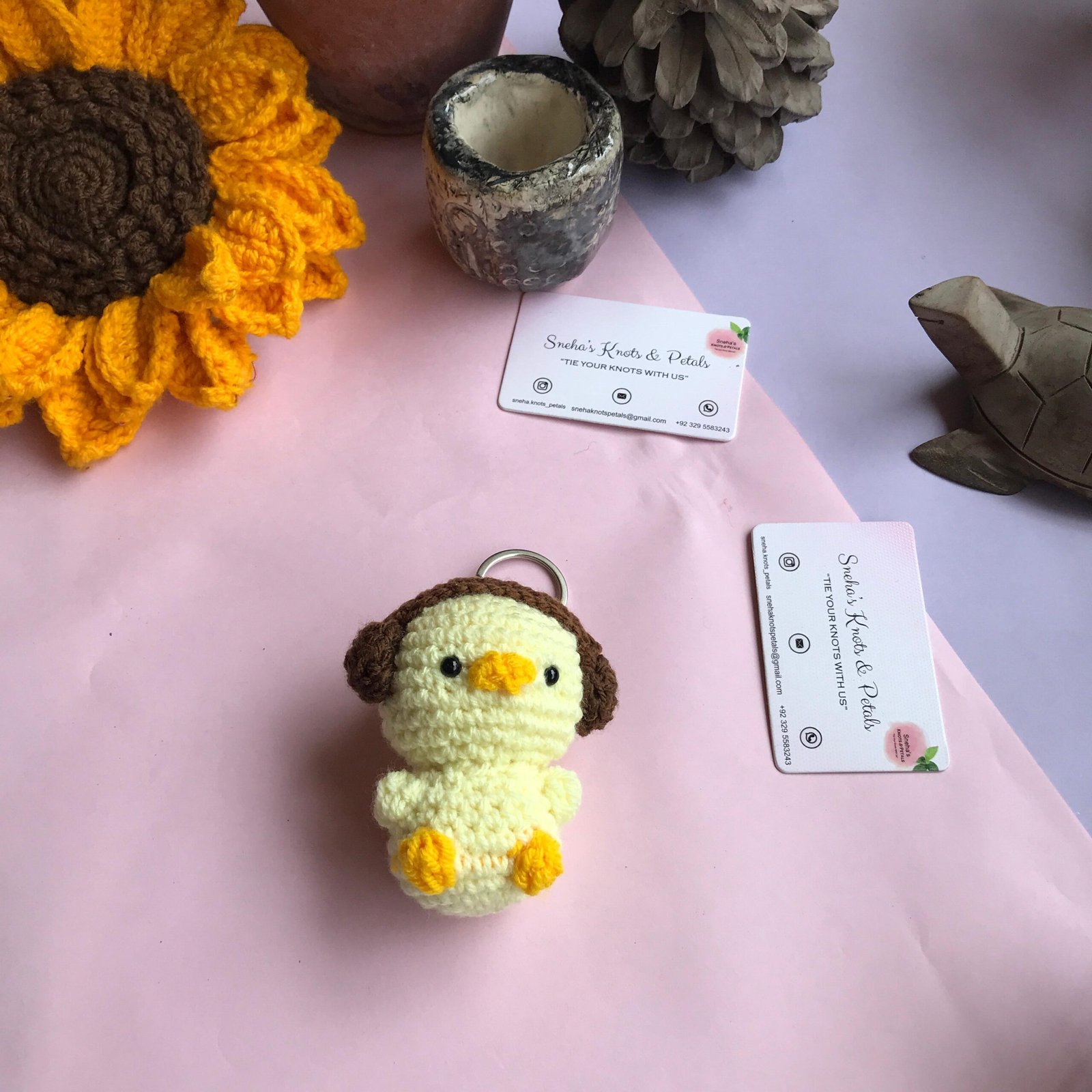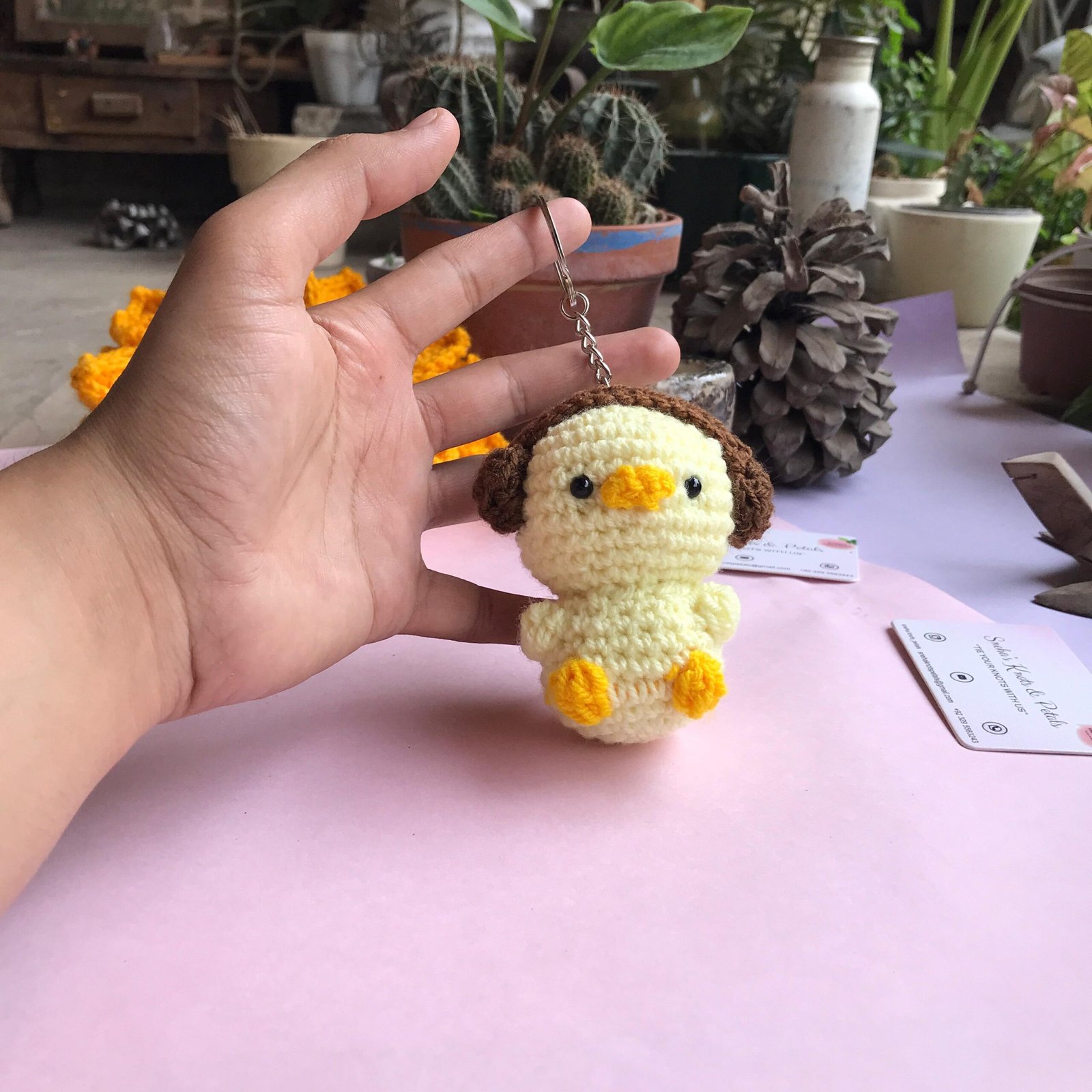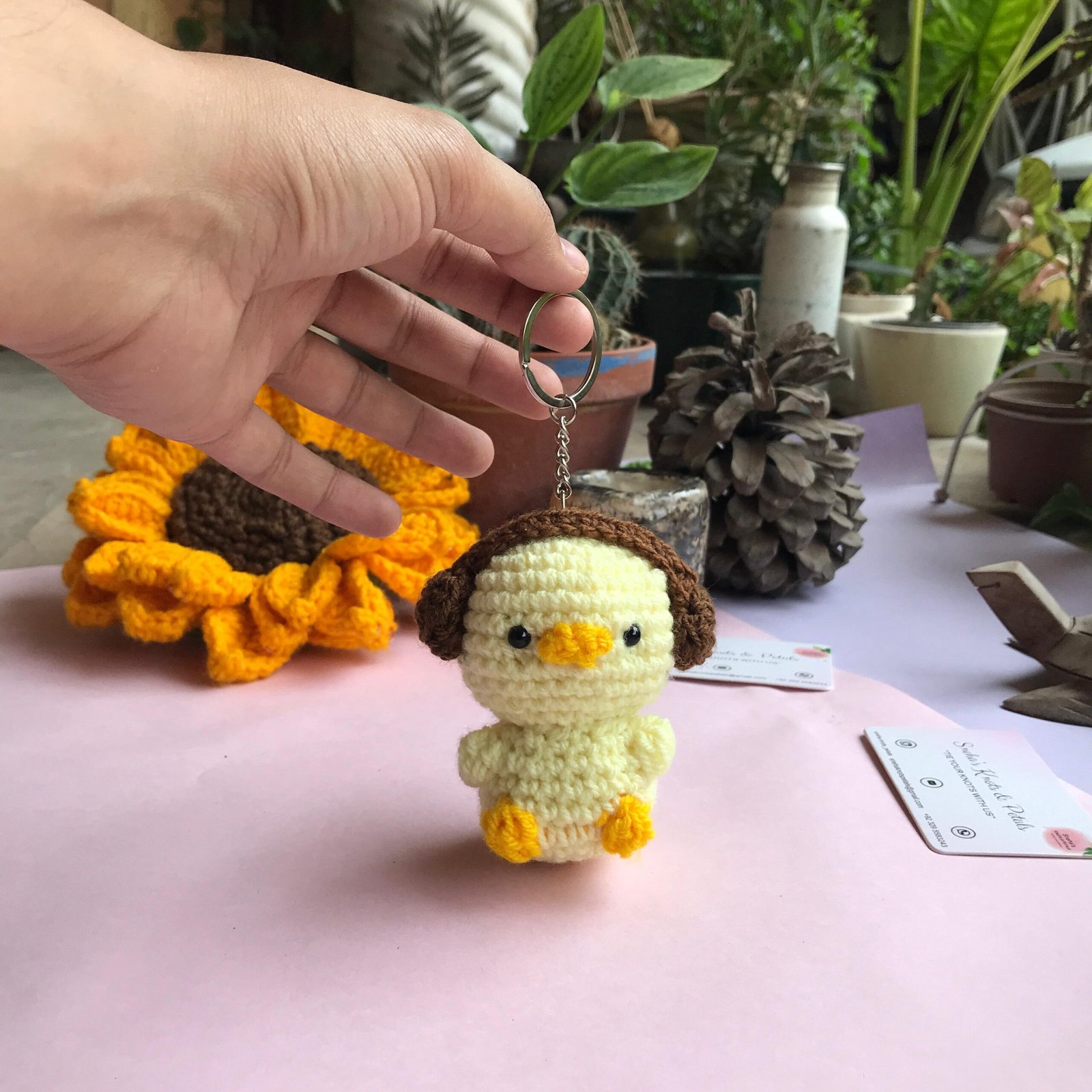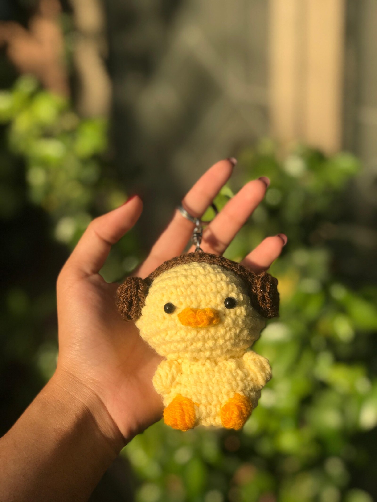 Add a quirky vibe to your keys with this adorable handmade crochet chick keychain featuring cute headphones! Crafted with attention to detail, this yellow chick with brown headphones and orange beak is attached to a sturdy metal keyring. Perfect as a unique gift or a fun accessory, it’s sure to bring a smile wherever you go!