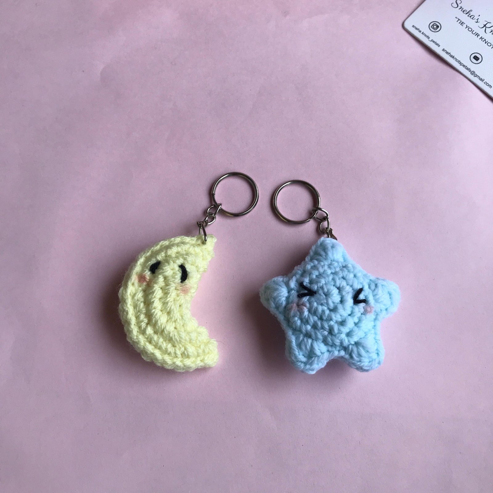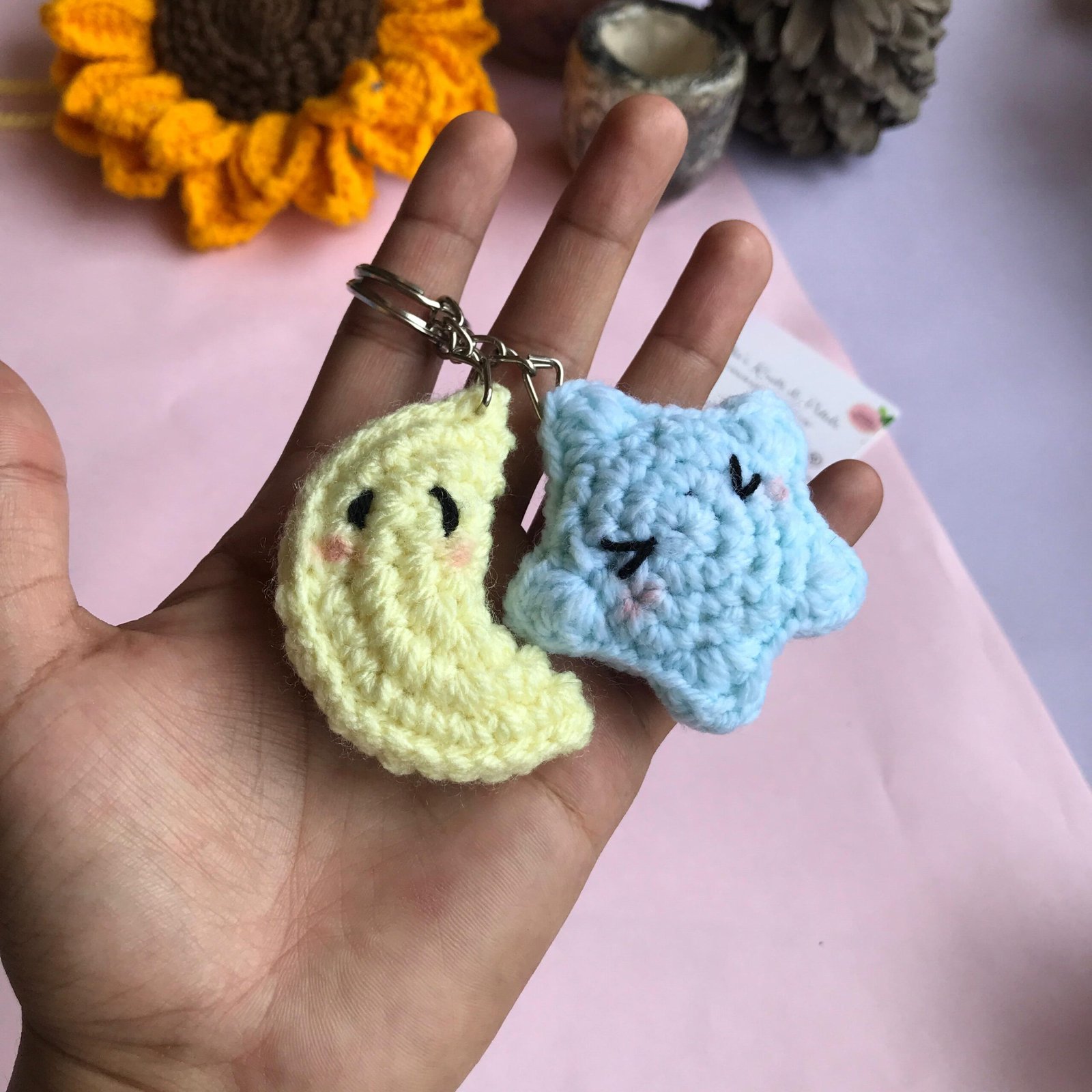 Celebrate love with our Handmade Crochet Moon & Star Couple Keychain! This adorable set features a smiling yellow crescent moon and a sleepy light blue star, both lovingly crafted and attached to sturdy metal keyrings. Perfect as a romantic gift, a matching couple accessory, or a symbol of connection, this charming duo beautifully combines whimsy, warmth, and craftsmanship.