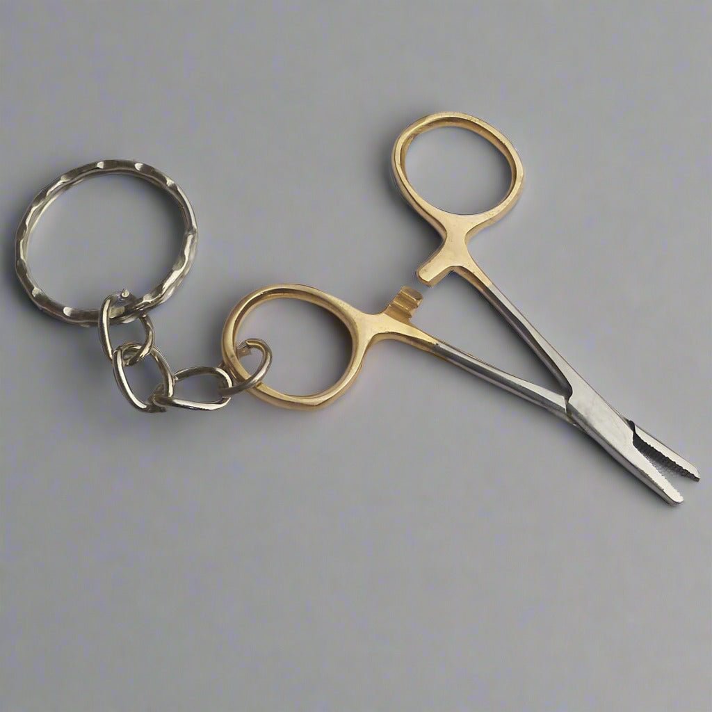Miniature Needle Holding Forceps Keychain with Gold-Plated Rings
