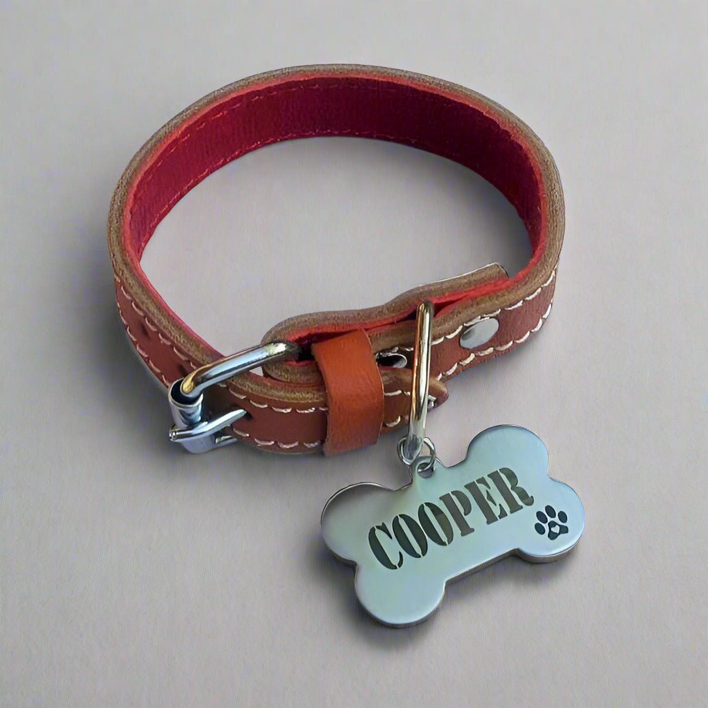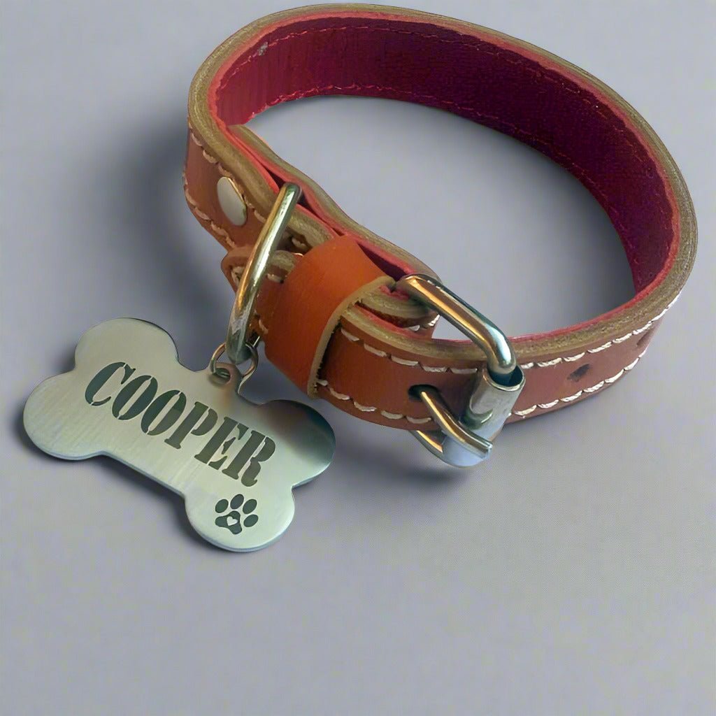 Handmade from 100% real cowhide leather, this collar features reinforced stitching, a heavy-duty metal buckle, and a solid D-ring for secure leash attachment. Each collar includes a stainless steel bone-shaped ID tag, custom laser engraved with your pet’s name for clear identification and lasting durability.