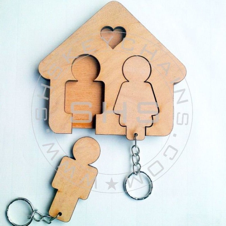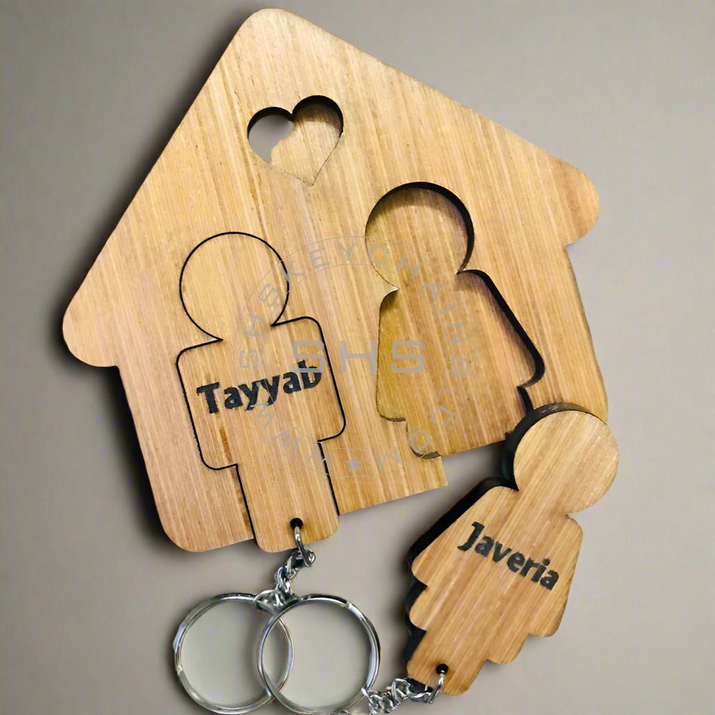 Celebrate love, togetherness, and the warmth of home with this beautifully crafted wooden couple keychain set featuring a house-shaped wall key holder with a heart detail.