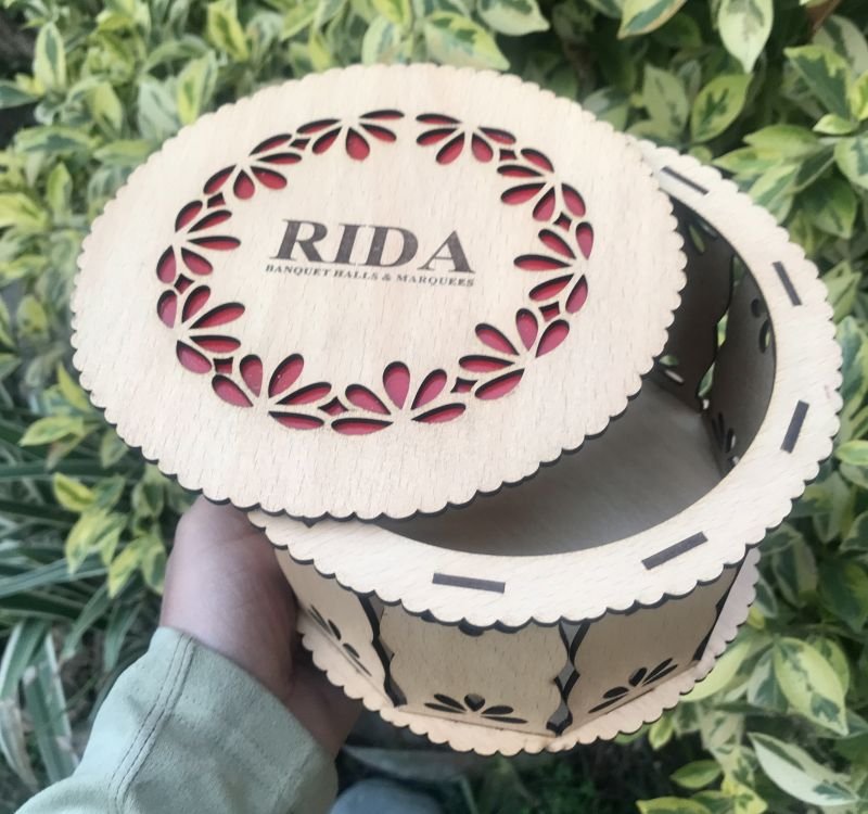 A premium round wooden gift box crafted from high-quality plywood with elegant laser-cut detailing. Designed specifically for weddings and special events, this box is perfect for presenting sweets, favors, and luxury gifts. The decorative lid and customizable top make it an excellent choice for branding, names, or event themes, adding a refined touch to any occasion.